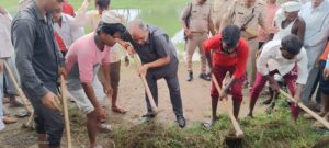 –मजदूरों के साथ अमृत सरोवर पर फावड़े से खुदाई कर मिट्टी फिंकवाते सांसद राजवीर सिंह।