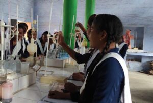 फोटो कैप्सन–कॉलेज की प्रयोगशाला में छात्र छात्राओं को प्रयोग सिखाते शिक्षक।