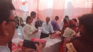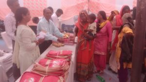 फोटो कैप्सन–सास-बहू-बेटा सम्मेलन में प्रतिभाग करने वाले लोगों को शगुन किट वितरित करते नोडल अधिकारी डा. सर्वेश कुमार, पीएचसी प्रभारी डा. राहुल यादव एवं डा. शोयेव।