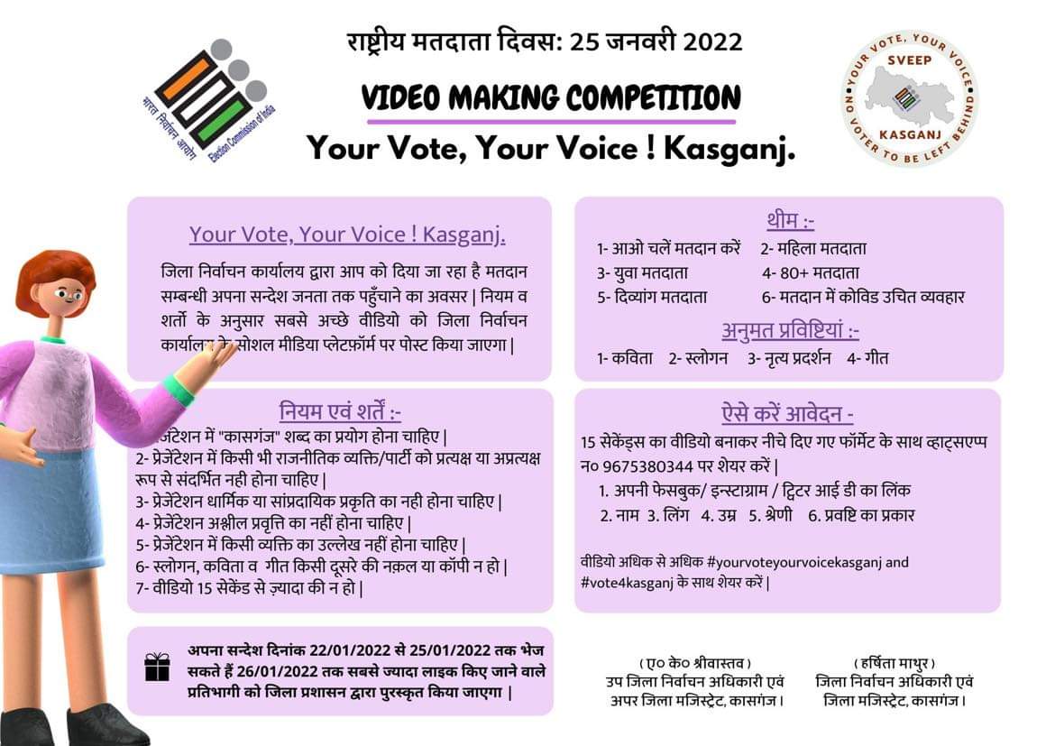 जिलाधिकारी ने जनसामान्य को अपना सन्देश आम जनता तक पहुंचाने अवसर देते हुये कहा कि आपका वोट आपकी आवाज है। सबसे अच्छे वीडियो को जिला निर्वाचन कार्यालय के सोशल मीडिया प्लेटफार्म पर पोस्ट किया जायेगा। साथ ही 26 जनवरी 2022 तक सबसे ज्यादा लाइक किये जाने वाले प्रतिभागी को जिला प्रशासन द्वारा पुरूस्कृत किया जायेगा। प्रेजेंटेशन में कासगंज शब्द का प्रयोग अवश्य होना चाहिये। किसी भी राजनैतिक व्यक्ति/पार्टी को प्रत्यक्ष या अप्रत्यक्ष रूप से संदर्भित न करें। प्रेजेंशन धार्मिक, साम्प्रदायिक या अश्लील प्रकृति का न हो। प्र्रजेंटशन में किसी व्यक्ति का उल्लेख नहीं होना चाहिये। स्लोगन, कविता या गीत किसी दूसरे की नकल या कापी न हो। वीडियो 15 सेकेन्ड से ज्यादा न हो।
