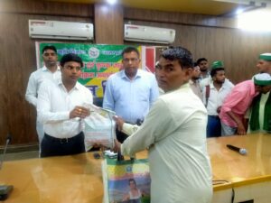 कासगंज: मुख्य विकास अधिकारी तेज प्रताप मिश्र की अध्यक्षता में कलेक्ट्रेट सभागार में किसान दिवस का आयोजन किया गया। जिसमें किसानों को कृषि से सम्बंधित योजनाओं एवं देय सुविधाओं की विस्तार से जानकारी दी गई। इस अवसर पर 10 किसानों को उर्द बीज के मिनी किट निःशुल्क वितरित किये गये।
