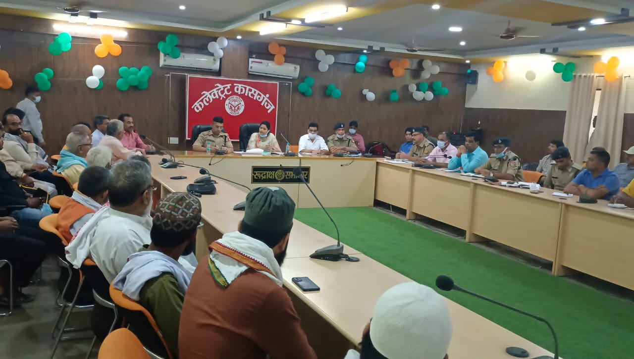 कासगंज: बुधवार को जिलाधिकारी कासगंज हर्षिता माथुर व पुलिस अधीक्षक कासगंज रोहन प्रमोद बोत्रे द्वारा जिलाधिकारी सभागार में जनपद के समस्त धर्मगुरुओ एवं सम्भ्रान्त व्यक्तियों के साथ गोष्ठी की गयी। गोष्ठी के दौरान आगामी आने वाले त्यौहार ईद आदि को शान्ति पूर्ण एवं सौहार्द पूर्ण वातावरण में मनाये जाने की अपील की गयी । इसके साथ ही बिना अनुमति के कोई भी कार्यक्रम न किया जाये साथ ही लाउडस्पीकर ध्वनि नियन्त्रण हेतु मा0 उच्च न्यायालय द्वारा पारित दिशा निर्देश का अनुपालन करने हेतु अवगत कराया गया ।