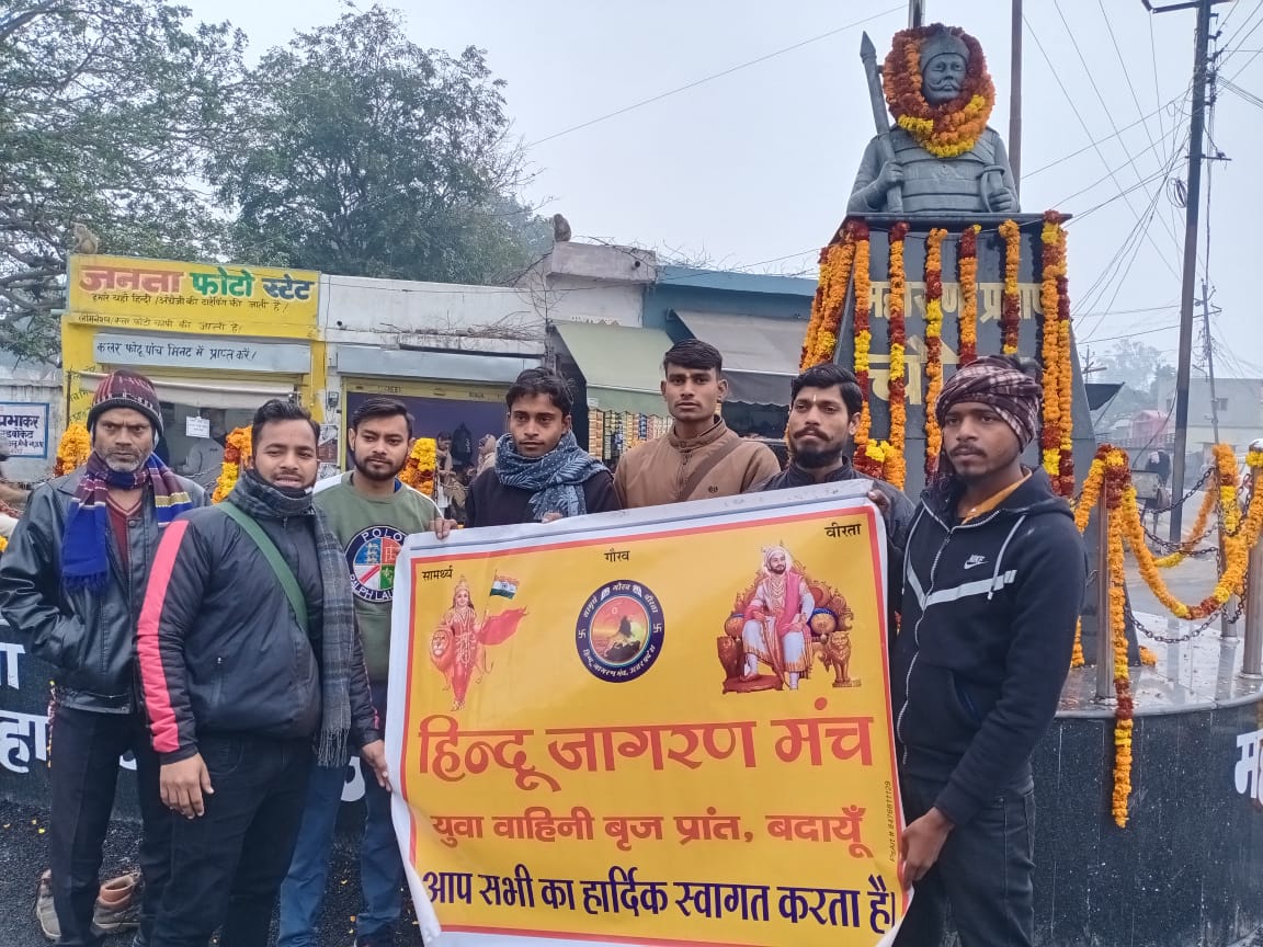 बदायूँ : वीर शिरोमणि महाराणा प्रताप जी की पुण्यतिथि पर हिंदू जागरण मंच युवा वाहिनी पदाधिकारियों ने नगर अध्यक्ष लवलेश साहू के नेतृत्व में महाराणा प्रताप चौक पर एकत्रित होकर उनकी प्रतिमा पर पुष्पमाला अर्पित कर विनम्र श्रद्धांजलि दी। नगर अध्यक्षा लवलेश साहू ने कहा मेवाड़ के महाराणा प्रताप को भारत समेत दुनियाभर में वीर योद्धा और शौर्य के प्रतीक के तौर आज भी याद किया जाता है। उन्होंने मुगलों के छक्के छुड़ा दिये थे। जिला उपाध्यक्ष सुनील गुर्जर ने कहा महाराणा प्रताप के रण कौशल, वीरता आदि का परिचय कराकर नम आंखों से श्रद्धांजलि अर्पित की। नगर महामंत्री पंकज साहू, नगर मंत्री शिवओम मथुरिया, आकाश पाल, गीतेश शर्मा आदि कार्यकर्ताओं ने श्रद्धांजलि अर्पित की। हिन्दू जागरण मंच युवा वाहिनी पदाधिकारियों की ओर से कोविड प्रोटोकॉल का पालन करते हुए श्रद्धांजलि दी गई।