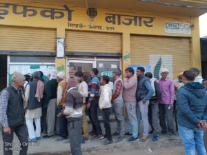 फोटो कैप्सन–मिरहची स्थित इफ्को किसान बाजार पर यूरिया खाद लेने के लिये किसानों की लगी कतार।