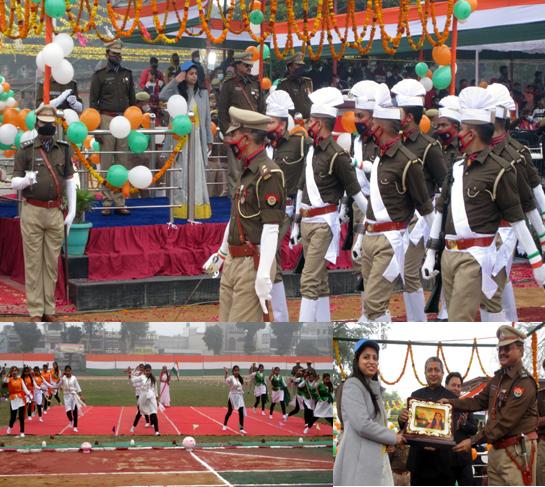 तत्पश्चात पुलिस परेड ग्राउंड में आयोजित कार्यक्रम में मुख्य अतिथि डीएम ने वरिष्ठ पुलिस अधीक्षक डॉ0 ओ0पी0 सिंह के साथ झण्डा फहराया कर परेड की सलामी ली। भारत को एक संपूर्ण प्रभुत्व संपन्न समाजवादी पंथ निरपेक्ष लोकतंत्रात्मक गणराज्य बनाने का संकल्प लिया। जनपद न्यायाधीश जफीर अहमद सहित डीएम व एसएसपी ने पुलिस अधिकारियों को मेडल व प्रतीक चिन्ह देकर सम्मानित किया। यहां देशभक्ति से सम्बंधित बच्चों द्वारा रंगारंग कार्यक्रम पेश किए गए। विभिन्न विद्यालयों द्वारा प्रस्तुत किए गए सांस्कृतिक कार्यक्रमों के बच्चों को डीएम ने प्रतीक चिन्ह देकर सम्मानित किया। डीएम व एसएसपी ने मतदान के महत्व को समझाते हुए सभी मतदाताओं से आगामी 14 फरवरी को मतदान करने की अपील की है। उन्होंने कहा कि सभी मतदाता स्वयं को अपने मताधिकार का प्रयोग करेंं ही, साथ ही अपने परिवार व पड़ोस के अन्य मतदाताओं को भी मतदान के लिए ले जाएं। लोकतंत्र के इस पर्व को पूरे उत्साह के साथ मनाया जाए। यहां मुख्य विकास अधिकारी ऋषिराज, एसपी सिटी प्रवीण सिंह चौहान, एसपी आरए सिद्धार्थ वर्मा सहित अन्य पूलिस अधिकारीगण मौजूद रहे। संचालन सर्वेन्द्र सिंह ने किया।