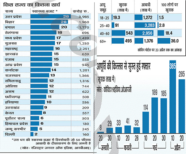 टीकाकरण पर राज्यों का खर्च : टीकाकरण की खरीद के लिए धन की व्यवस्था में राज्यों की भूमिका बहुत अहम है। अपनी योग्य आबादी के 50 फीसद को टीकाकरण के लिए (दोनों खुराक) या वैकल्पिक रूप से 75 फीसद आबादी को एक खुराक और 25 फीसद को दोनों खुराक से आगे बढ़ना होगा। सबसे बड़े राज्य को अपनी आबादी के टीकाकरण के लिए अपने सालाना स्वास्थ्य बजट का एक तिहाई खर्च करना पड़ सकता है। केरल, उत्तराखंड, दिल्ली और हरियाणा के साथ पूर्वोत्तर के अधिकांश राज्य अपने सालाना स्वास्थ्य बजट में आसानी से इस राशि का प्रबंध कर सकते हैं।