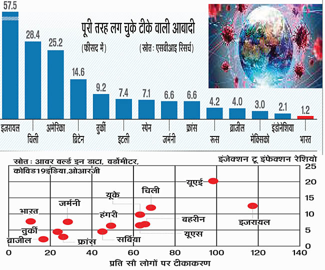 कुल टीकों में भारत शीर्ष पांच में : आबादी के हिसाब से टीकाकरण में भारत भले ही पिछड़ता दिखे, लेकिन अब तक लगाए गए कुल टीकों की संख्या में वह शीर्ष पांच देशों में जगह बनाता है। इसका इंजेक्शन टू इंफेक्शन रेट कुछ यूरोपीय देशों से भी बेहतर है। हालांकि यूरोपीय देश टीकाकरण की जा चुकी आबादी की हिस्सेदारी में आगे हैं।