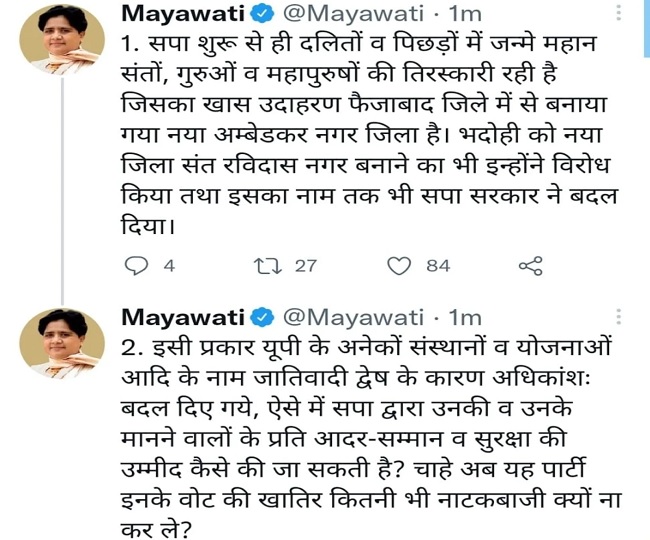 उत्तर प्रदेश की पूर्व मुख्यमंत्री मायावती ने समाजवादी पार्टी पर देश के महान दलित व पिछड़ों के संतों तथा गुरुओं का तिरस्कार करने का बड़ा आरोप लगाया है। मायावती ने कहा कि समाजवादी पार्टी शुरू से ही दलितों व पिछड़ों में जन्मे महान संतों, गुरुओं की तिरस्काती रही है। उन्होंने कहा कि इसका खास उदाहरण फैजाबाद जिले में से बनाया गया अम्बेडकर नगर है। भदोही को नया जिला संत रविदास नगर बनाने का भी विरोध किया तथा इसका नाम भी समाजवादी पार्टी की सरकार ने बदल दिया था।
